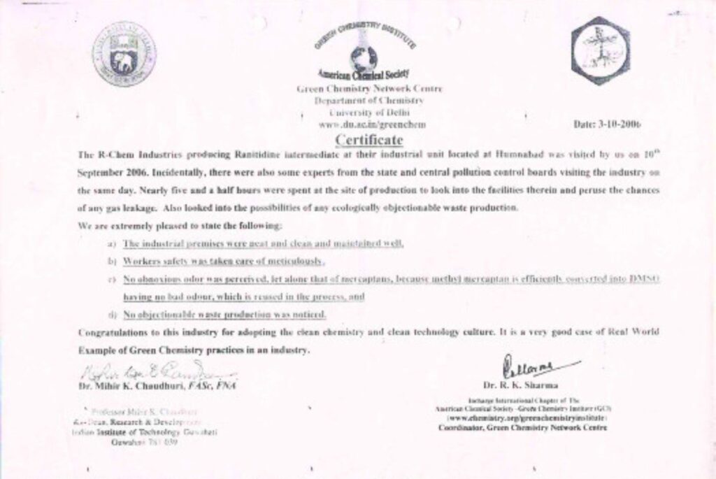 Awarded for our breakthrough efforts in handling mercaptan during the synthesis stage of Ranitidine Base, showcasing our commitment to safer, more sustainable chemical processes.